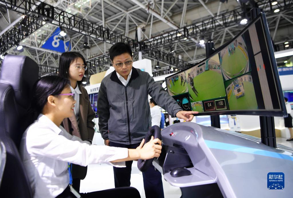 4月26日,在第六屆數(shù)字中國建設(shè)成果展覽會(huì)上,觀眾體驗(yàn)金龍5G遠(yuǎn)程駕駛。新華社記者 魏培全 攝