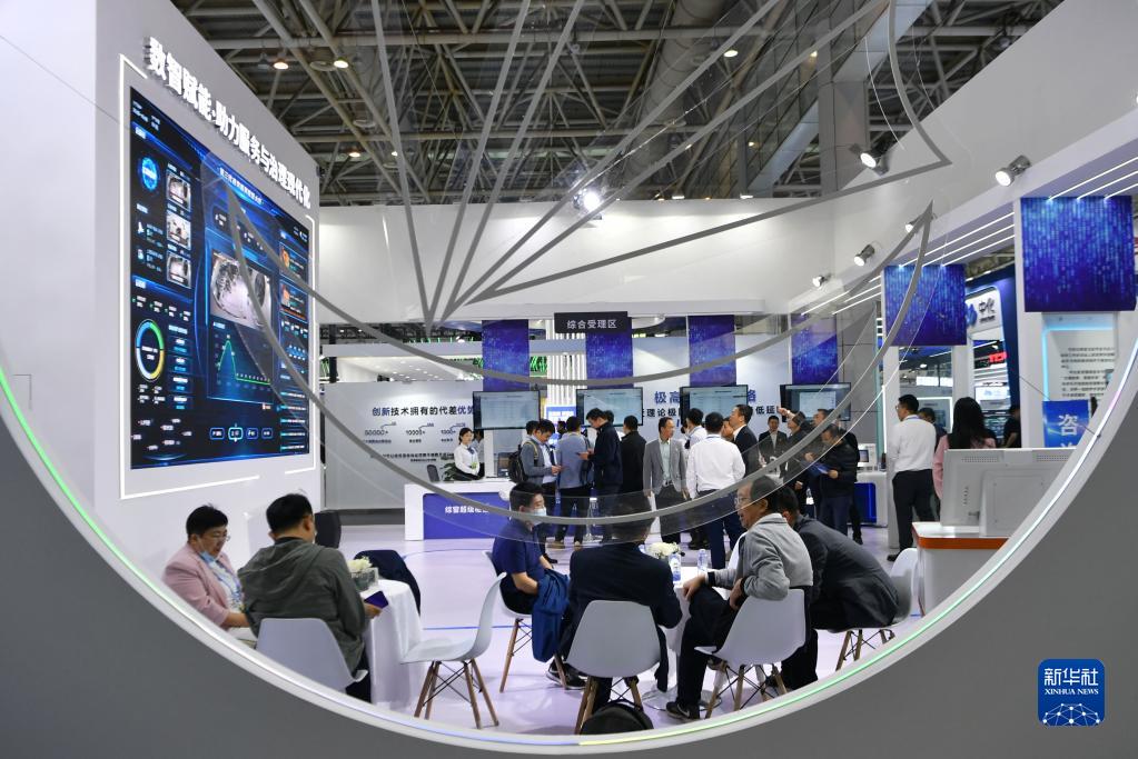 4月26日在第六屆數(shù)字中國建設(shè)成果展覽會(huì)上拍攝的數(shù)智賦能·助力服務(wù)與治理現(xiàn)代化展區(qū)一景。新華社記者 魏培全 攝