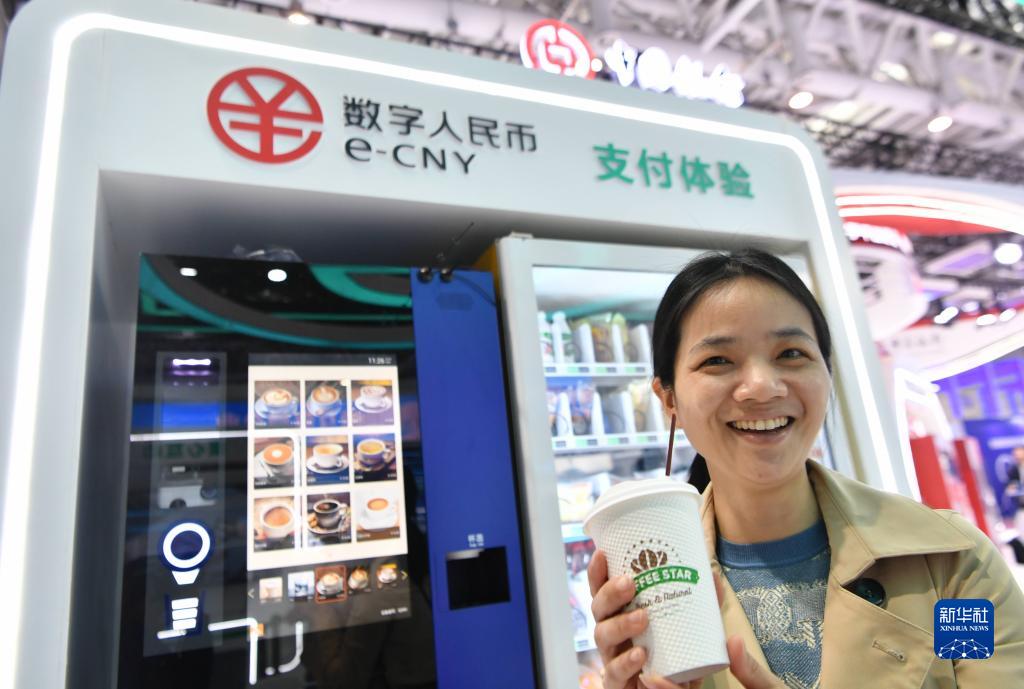 4月26日,在第六屆數(shù)字中國建設(shè)成果展覽會(huì)現(xiàn)場,一名觀眾展示用數(shù)字人民幣購買的咖啡。新華社記者 魏培全 攝
