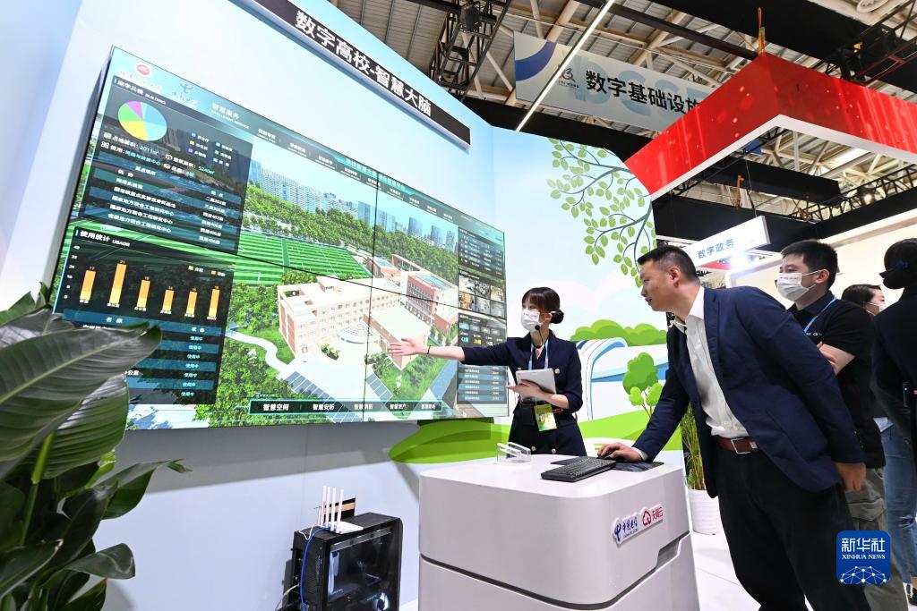 4月26日,數(shù)字福建建設(shè)成果專區(qū)工作人員在展覽現(xiàn)場向參觀者介紹數(shù)字高校智慧大腦綜合管理平臺,該平臺由福建師范大學(xué)和中國電信福州分公司聯(lián)手打造。新華社記者 林善傳 攝