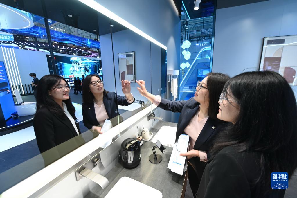 4月26日,參觀者在展覽現(xiàn)場了解支持鴻蒙智聯(lián)的九牧衛(wèi)浴智能產(chǎn)品。新華社記者 林善傳 攝