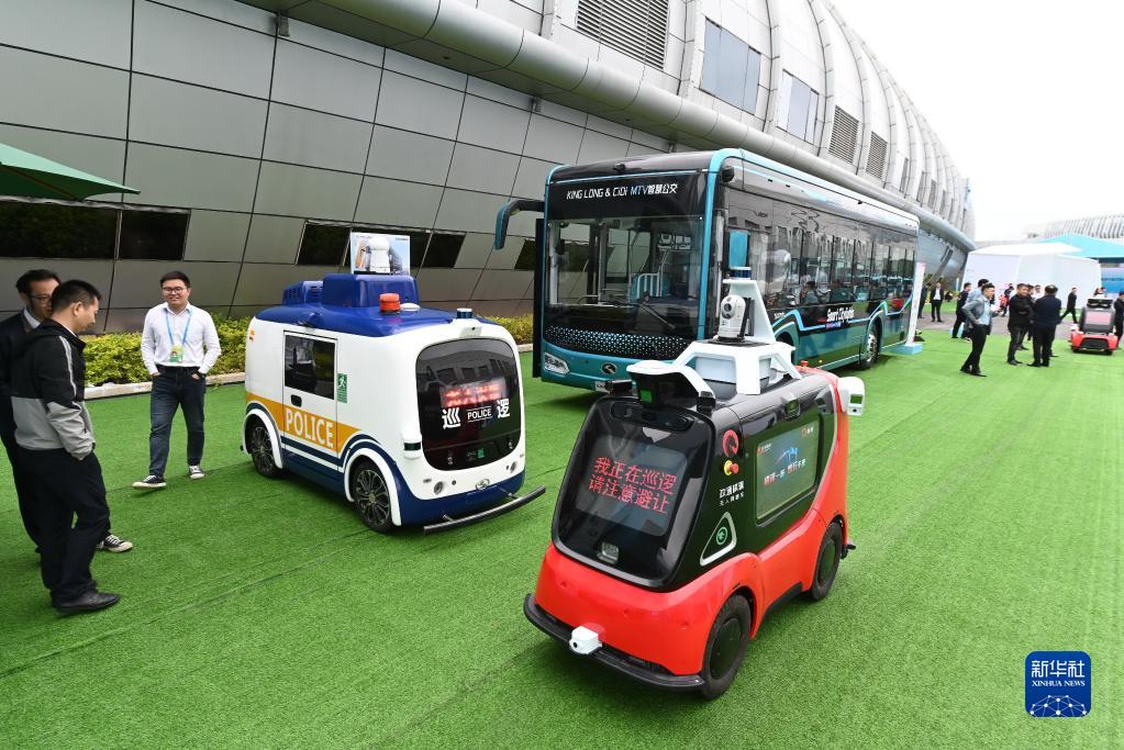 4月26日在第六屆數(shù)字中國建設(shè)成果展覽會(huì)上拍攝的多種智慧車輛。新華社記者 林善傳 攝
