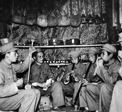 《歌唱祖國》的作者王莘(左二)在抗美援朝戰(zhàn)場防空洞內(nèi)教志愿軍戰(zhàn)士演奏這首歌曲。