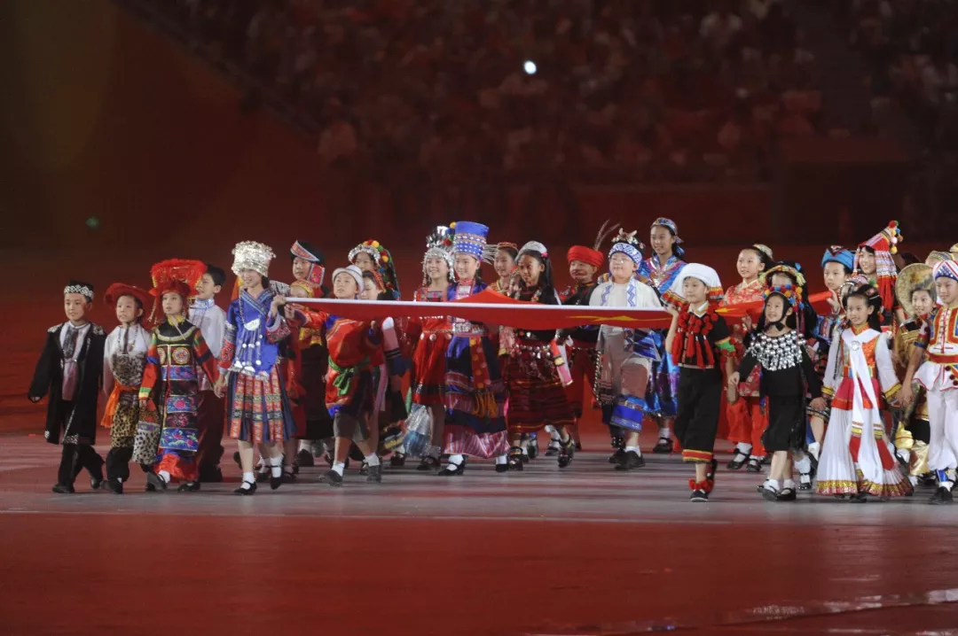 在2008年北京奧運會開幕式上,各民族兒童在《歌唱祖國》的旋律中簇?fù)碇r艷的中國國旗入場。(資料圖片)