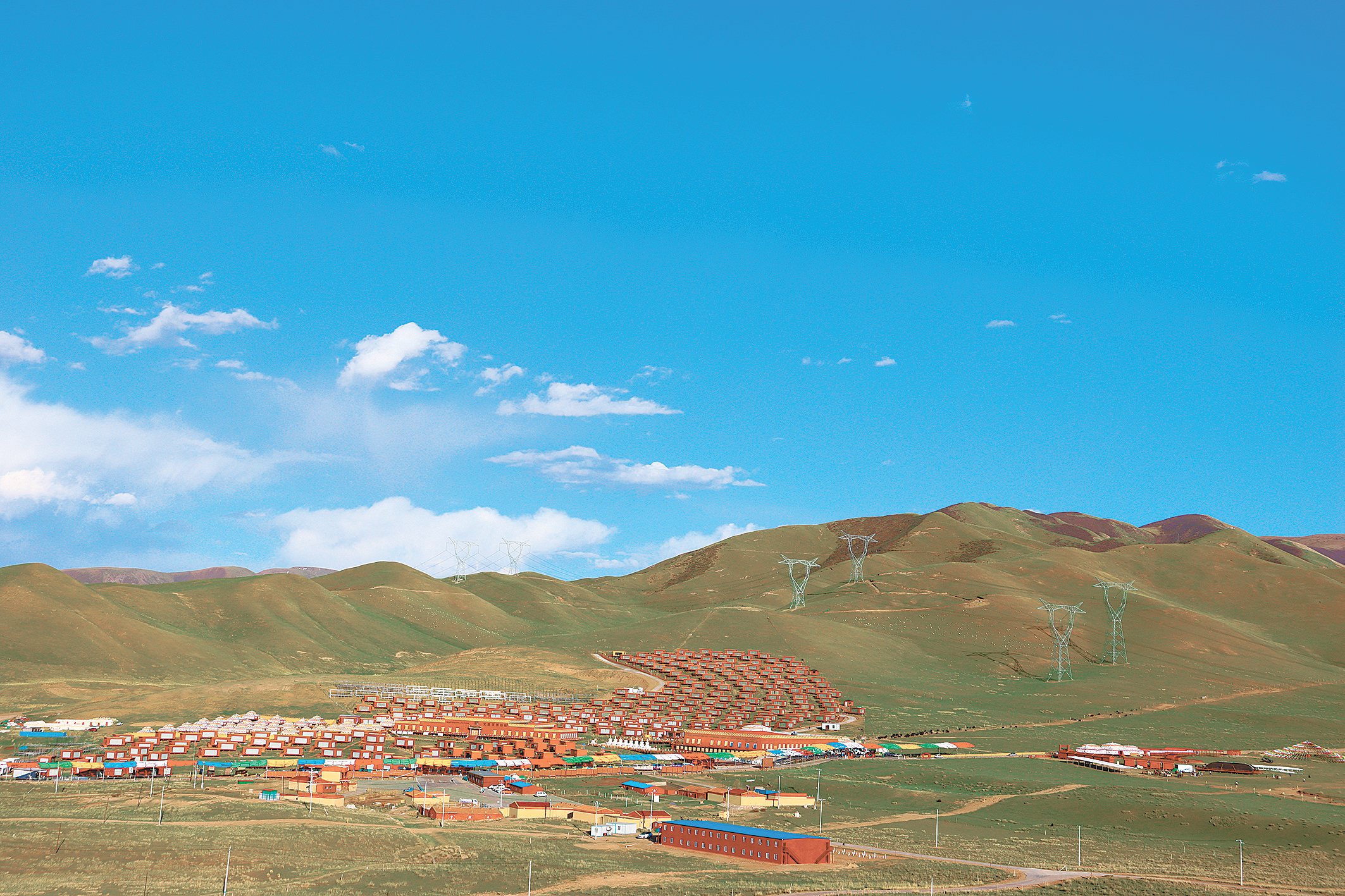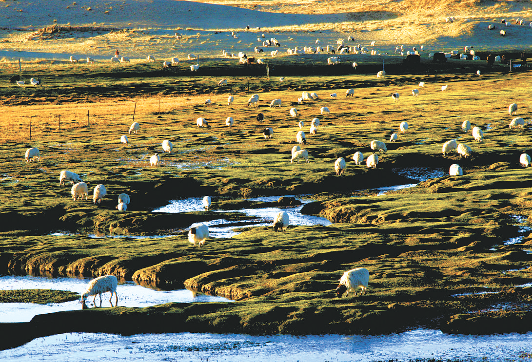 盛夏的金銀灘草原綠草如茵,花開萬頃。草原上,牧民騎著駿馬穿梭在雪白的羊群和棕黑相間的牦牛群間,蓮花般的帳房星星點(diǎn)點(diǎn)地散落在青草和野花叢中,如詩如畫、美不勝收,呈現(xiàn)出人與自然和諧相處的美妙景象。
