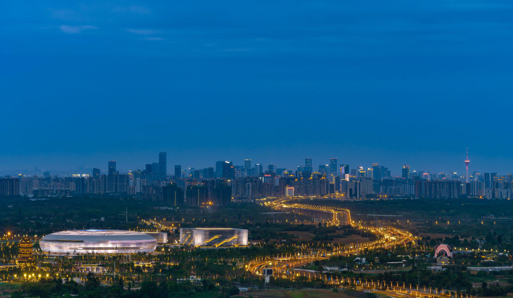 從龍泉山俯瞰夜幕下的東安湖體育公園(7月23日攝),成都大運會開幕式將于28日晚在此舉行。新華社發(fā)(廖鐵軍攝)