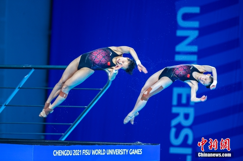 7月31日,在成都簡(jiǎn)陽市文體中心游泳館舉行的第31屆世界大學(xué)生夏季運(yùn)動(dòng)會(huì)跳水女子雙人10米跳臺(tái)決賽中,中國組合張家齊/掌敏潔以349.08分的成績(jī)獲冠軍。圖為張家齊(右)/掌敏潔在比賽中。中新社記者 劉忠俊 攝