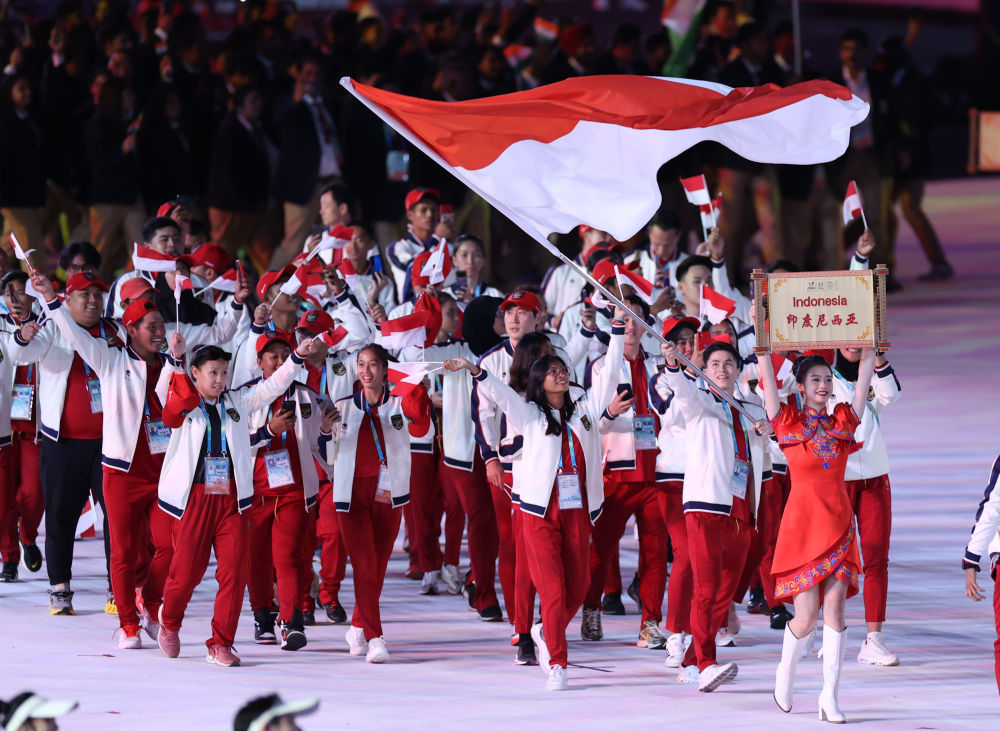 7月28日,印度尼西亞大學(xué)生體育代表團(tuán)在開幕式上入場。新華社記者 張麗蕓 攝