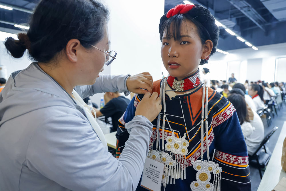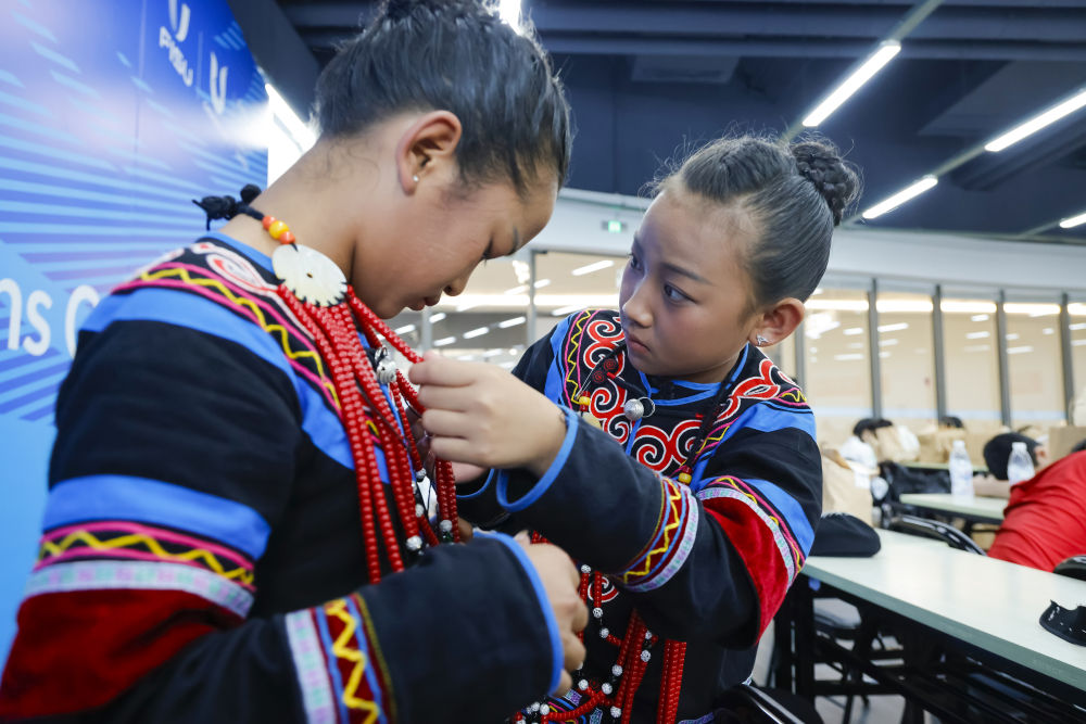 7月23日,在成都大運(yùn)會(huì)開幕式彩排之前,吉合拉作(右)幫助俄地惹漢整理飾品。新華社記者沈伯韓 攝