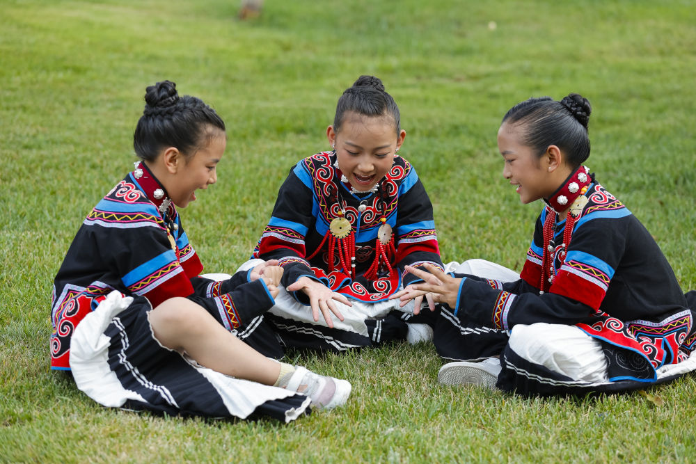 7月23日,在成都大運(yùn)會(huì)開幕式彩排之前,馬杰英、吉合拉作和俄地惹漢(從左至右)坐在草地上玩游戲。新華社記者沈伯韓 攝
