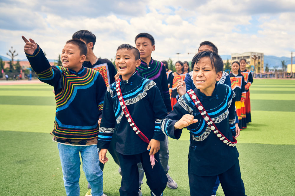 7月2日,在昭覺縣萬達(dá)融創(chuàng)紅絲帶愛心學(xué)校參與排練的吉子醫(yī)生(前中)和吉朵史拉(前右)。(受訪者供圖)
