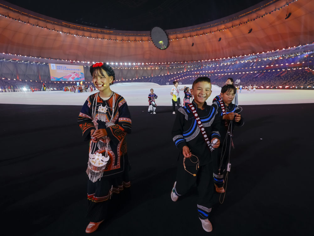 7月28日,來自四川涼山彝族自治州的孩子們?cè)诔啥即筮\(yùn)會(huì)開幕式上歌唱。新華社記者 陳澤國 攝