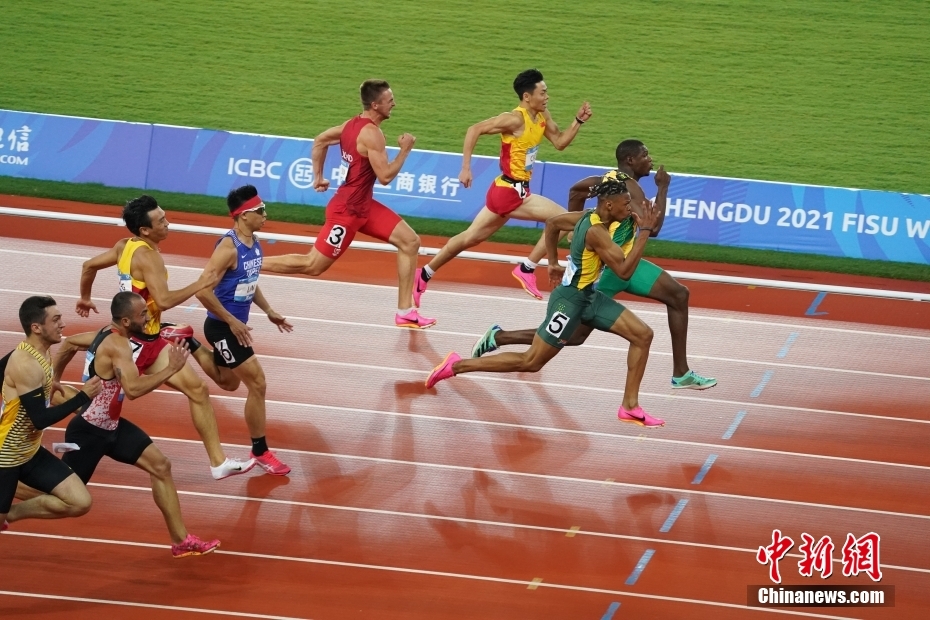 8月2日,第31屆世界大學(xué)生夏季運(yùn)動(dòng)會(huì)男子100米決賽在四川成都舉行,牙買(mǎi)加選手GOLDSON Kadrian dwayne(右一)以10秒04奪得男子百米冠軍。