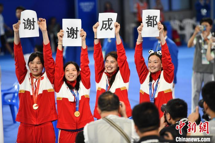 當(dāng)四位中國女將高高舉起“謝謝成都”四個(gè)大字,成都東安湖體育公園游泳跳水館沸騰了。7日晚,中國大學(xué)生游泳隊(duì)運(yùn)動(dòng)員柳雅欣、朱蕾桔、張雨霏和李冰潔在頒獎(jiǎng)儀式后拿出了這份特別的禮物:感謝觀眾的陪伴與支持,也感謝成都的熱情與包容。