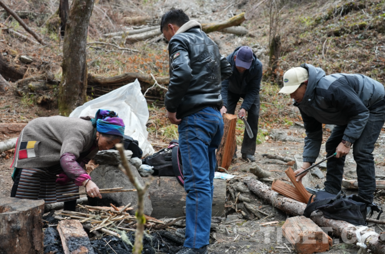 過(guò)了兩個(gè)小時(shí),我們到達(dá)了平時(shí)巡邊人休息的地方。有人撿柴火、有人去接水,每個(gè)人都分工明確。扎西江村的背包里帶著方便面、優(yōu)樂(lè)美奶茶、可樂(lè)等,巡邊的每位隊(duì)員都拿出了自己包里的食物與大家分享。大家圍坐一起有說(shuō)有笑,完全忘記了一路的艱辛與疲憊。