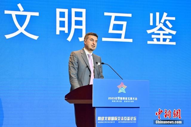 7月18日,2023年中國網(wǎng)絡(luò)文明大會(huì)網(wǎng)絡(luò)文明國際交流互鑒論壇在廈門舉辦。中外嘉賓圍繞加強(qiáng)網(wǎng)絡(luò)文明交流、互鑒、共存等話題展開探討。圖為中國—阿拉伯國家博覽會(huì)顧問委員會(huì)委員肖克作主題演講。中新社記者 王東明 攝