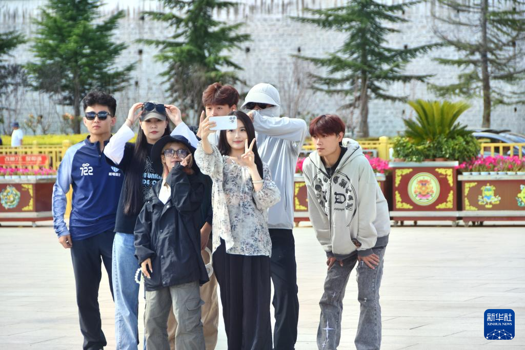 8月17日,布達(dá)拉宮廣場(chǎng),游客們拍照留念。新華社記者 劉文博 攝