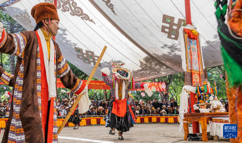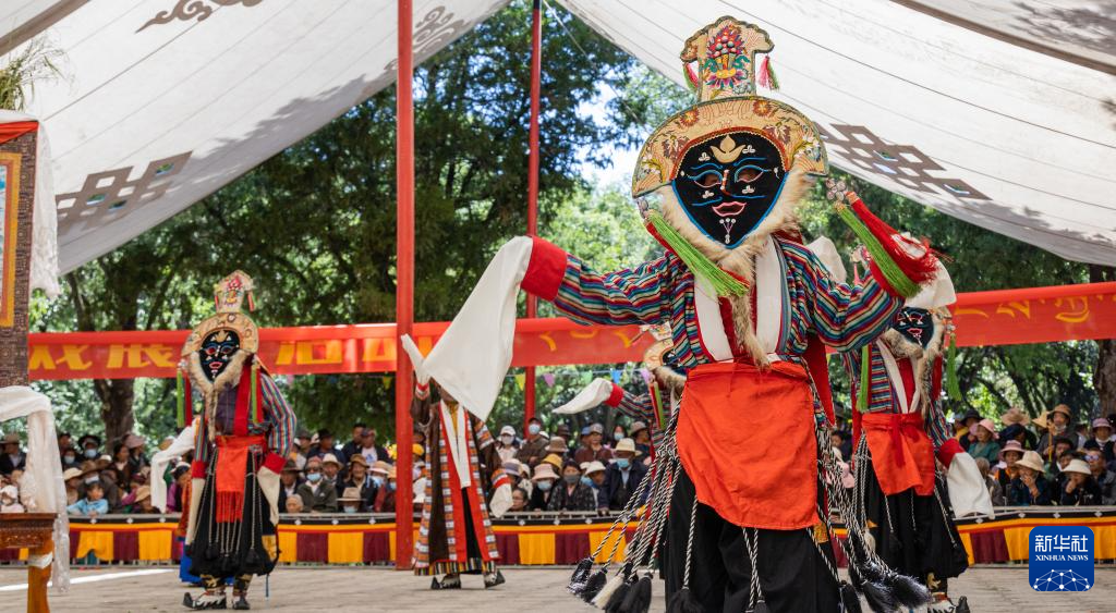 8月19日,在拉薩市羅布林卡園林內(nèi),貢嘎縣乃薩藏戲隊(duì)在為觀眾表演藏戲《朗薩雯崩》。新華社發(fā)(丁增尼達(dá)攝)