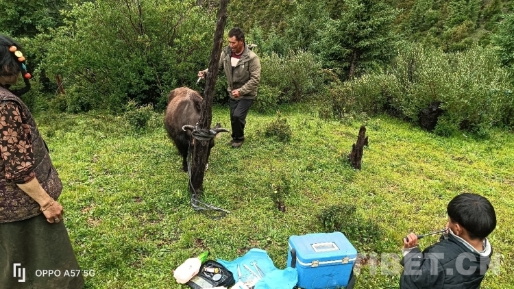 只見那頭受傷的牛被拴在木樁上,尾巴處還帶有一些血跡,顯得非常虛弱。索杰醫(yī)生先是把手術(shù)的傷口處仔細(xì)檢查了一遍,然后取來藥箱,在傷口處給藥,他告訴牧民家的男主人,牛恢復(fù)得還可以,不要太擔(dān)心,留下的藥是這幾天涂抹和口服的,要按時(shí)服用。