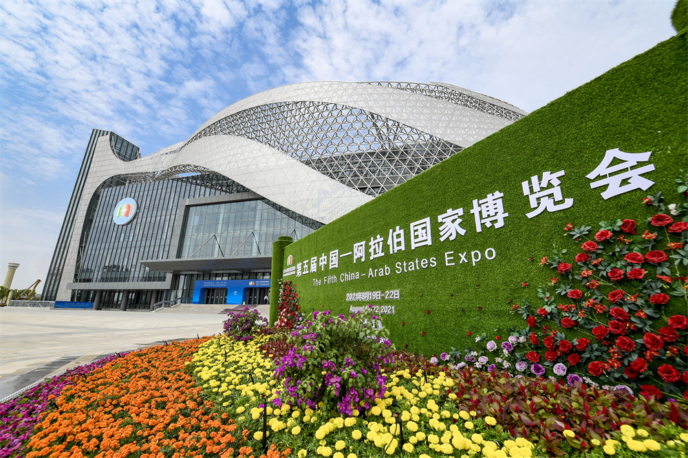 這是2021年8月18日拍攝的第五屆中國-阿拉伯國家博覽會(huì)開幕大會(huì)會(huì)址——寧夏國際會(huì)堂外景。新華社記者 馮開華 攝