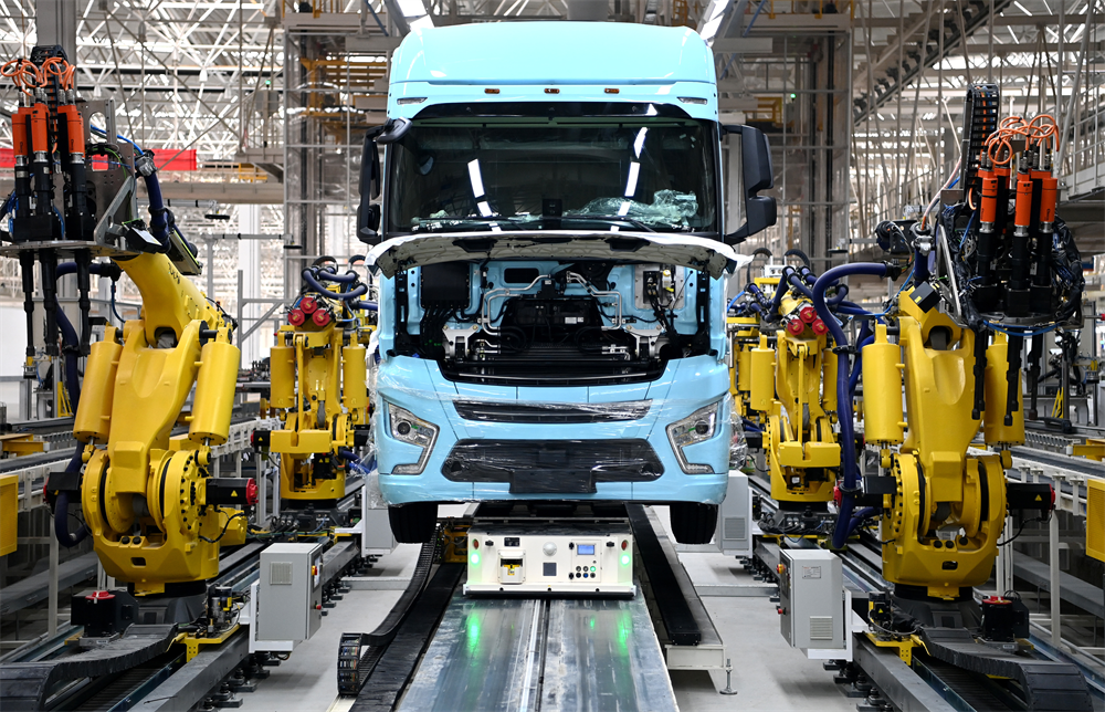 在陜汽重卡擴(kuò)能項(xiàng)目現(xiàn)場,一輛重卡在汽車總裝生產(chǎn)線輪胎自動(dòng)化裝配擰緊無人工作站進(jìn)行裝配(2022年9月27日攝)。新華社記者 劉瀟 攝