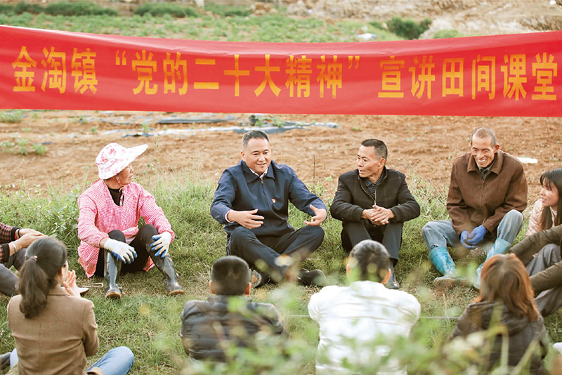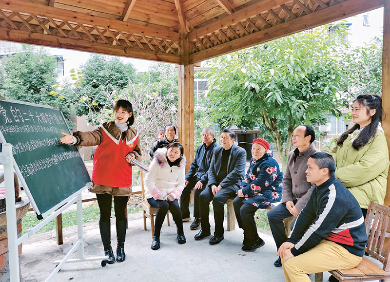 圖為2022年11月30日,四川省眉山市仁壽縣黑龍灘鎮(zhèn)流動(dòng)“小黑板”宣講小分隊(duì)在四海社區(qū)宣講黨的二十大精神。 人民圖片 潘帥/攝