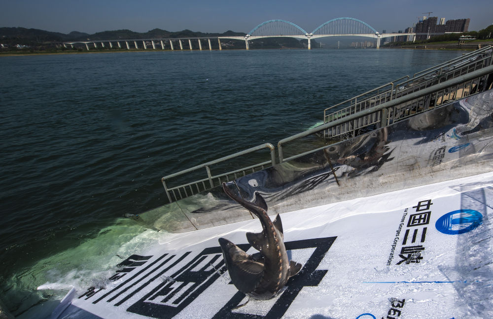 在湖北省宜昌市舉行的“2022年長江三峽中華鱘放流活動”現(xiàn)場,中華鱘從放流通道滑入長江(4月9日攝)。新華社發(fā)(鄭家裕 攝)