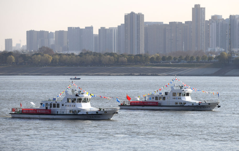 漁政執(zhí)法船隊(duì)從長江武漢段江面駛過,啟動長江流域重點(diǎn)水域“十年禁漁”(2020年12月31日攝)。新華社記者 程敏 攝