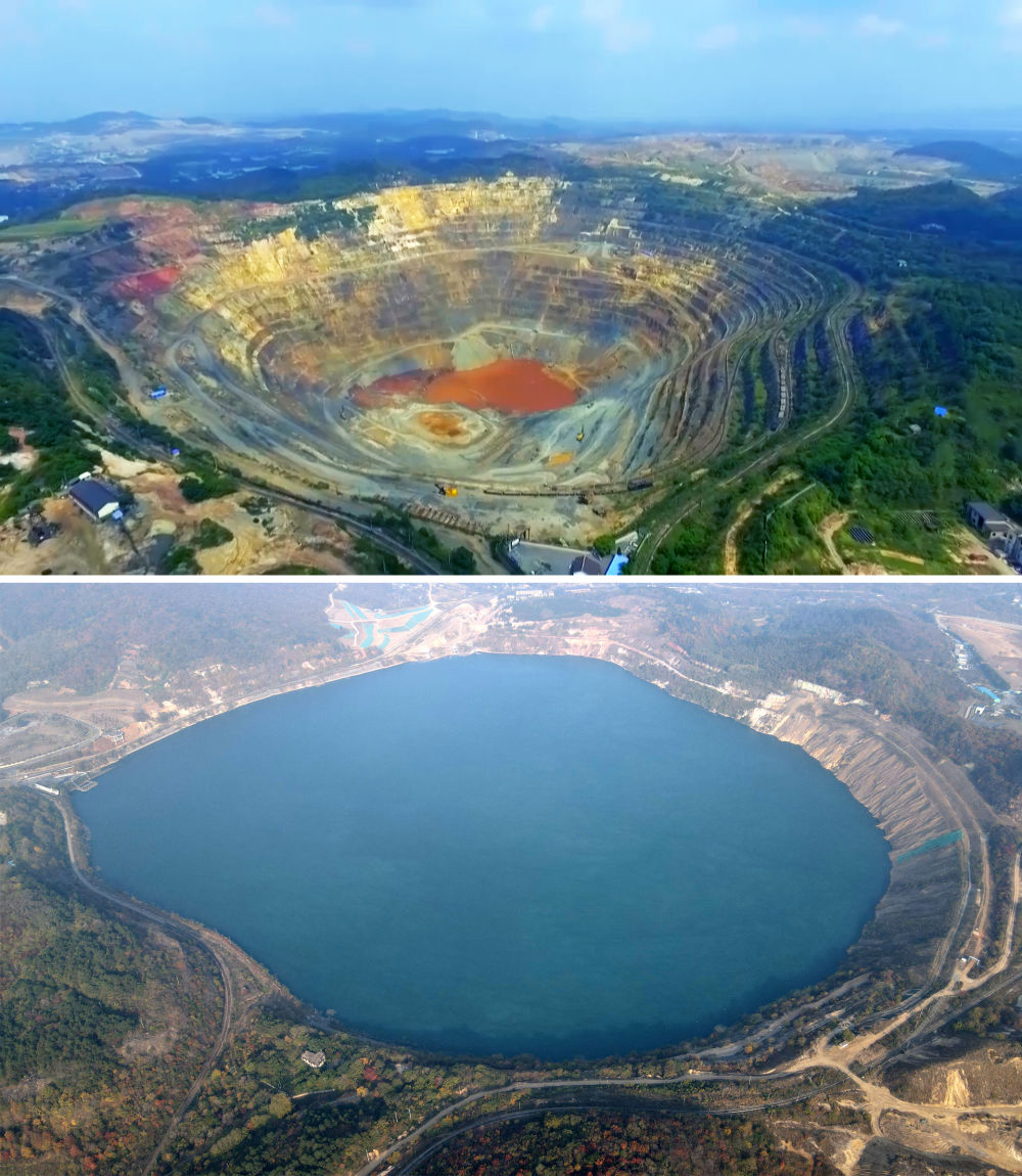 拼版照片:上圖為開采中的安徽省馬鞍山市雨山區(qū)向山鎮(zhèn)凹山采場(資料照片),下圖為生態(tài)修復(fù)后的凹山采場(新華社記者劉軍喜11月8日攝,無人機(jī)照片)。新華社發(fā)