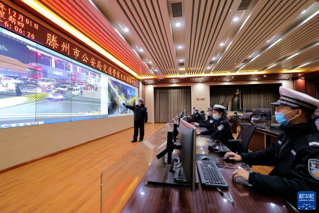 12月1日,在山東省滕州市公安局交警大隊指揮中心,借助“情、指、勤、督”一體化智慧交通管理平臺,民警對各個路口及路段交通流數(shù)據(jù)進行綜合分析。新華社發(fā)(鐘自增 攝)