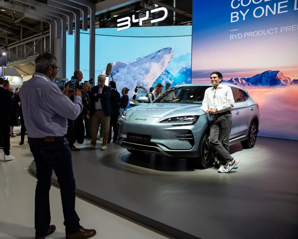 9月4日,在德國慕尼黑國際車展媒體預展上,參觀者在比亞迪品牌發(fā)布會現(xiàn)場與BYD SEAL U汽車合影。新華社記者 張帆 攝