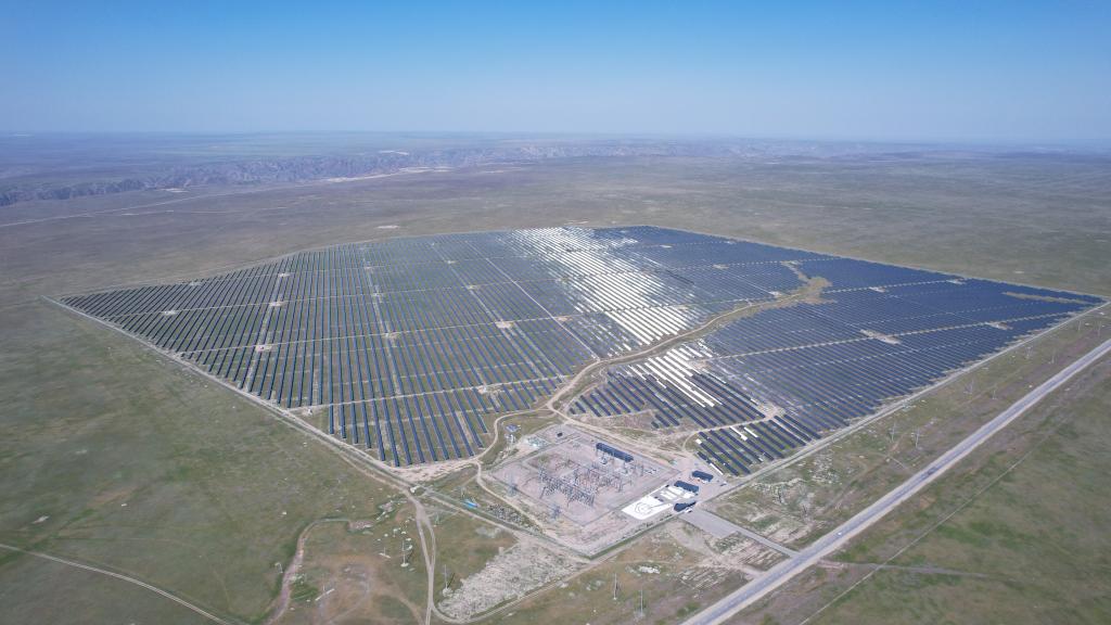 這是5月4日在哈薩克斯坦阿拉木圖州拍攝的卡普恰蓋100兆瓦光伏電站(無人機照片)。這是哈薩克斯坦單體最大的光伏發(fā)電項目之一,也是中哈綠色能源合作項目之一。新華社發(fā)(奧斯帕諾夫攝)