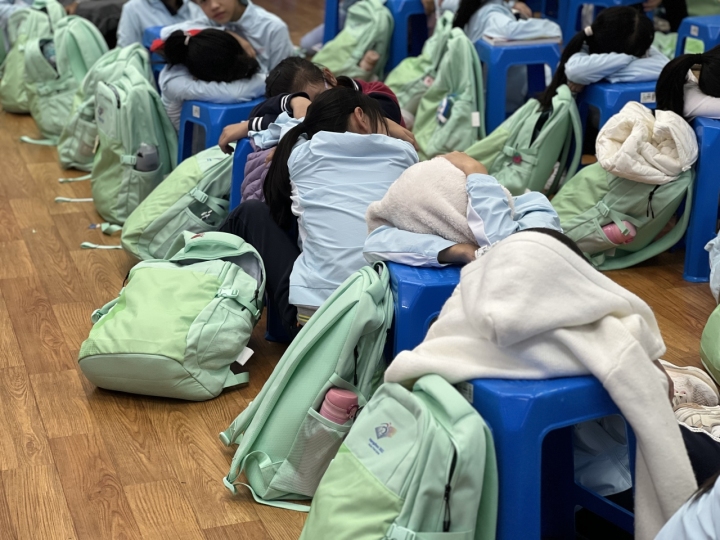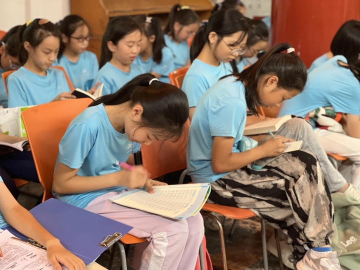 除了排練,他們還有作業(yè)和日常生活。排練現(xiàn)場(chǎng),時(shí)常能見到孩子們?cè)趭^筆疾書或者抓住碎片時(shí)間小憩,作業(yè)和打卡一次都沒(méi)落下。“我們?nèi)粘Mㄖ啪毜臅r(shí)候,也會(huì)喊他們帶上作業(yè),即便在開幕式上,后臺(tái)還碼著他們的書包,作業(yè)都是隨身攜帶的?!?/p>