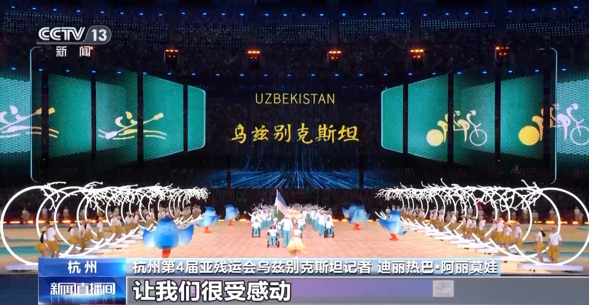 杭州第4屆亞殘運(yùn)會(huì)烏茲別克斯坦記者 迪麗熱巴 阿麗莫娃:當(dāng)我們國(guó)家的代表團(tuán)入場(chǎng)時(shí)受到了全場(chǎng)熱情的歡迎,讓我們很受感動(dòng),烏茲別克斯坦和中國(guó)是最好的朋友。我們的總統(tǒng)最近在北京參加了“一帶一路”國(guó)際合作高峰論壇。我們與中國(guó)有很多的合作項(xiàng)目,我相信我們兩國(guó)的友誼和在各個(gè)領(lǐng)域的合作未來(lái)將一直持續(xù)下去。