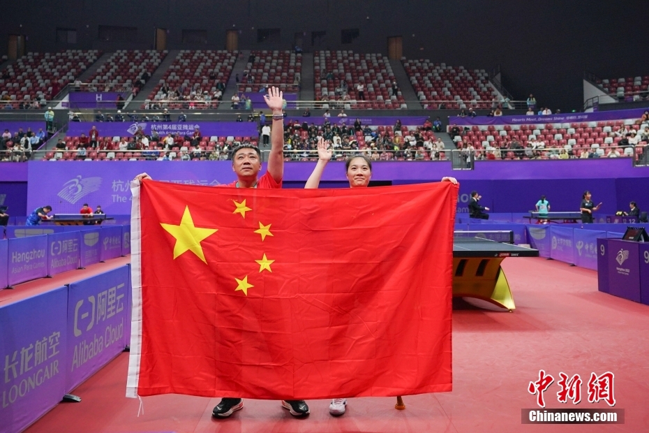 10月25日,杭州第4屆亞殘運(yùn)會(huì)乒乓球女子單打Class 8決賽在拱墅運(yùn)河體育公園體育館進(jìn)行。中國(guó)隊(duì)選手黃文娟以3比2戰(zhàn)勝日本隊(duì)選手友野有理獲得冠軍。圖為黃文娟(右)與教練在比賽后向觀眾揮手致意。