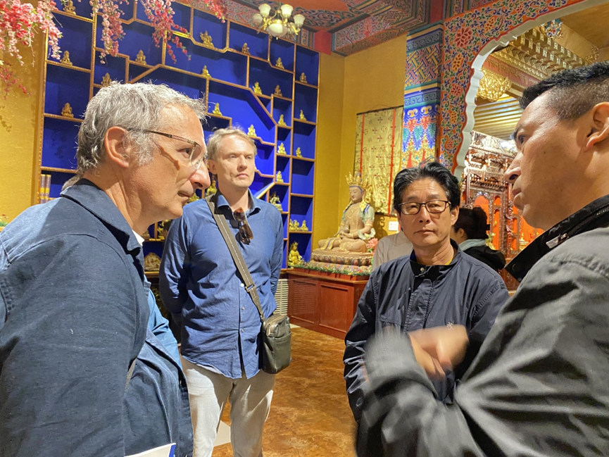 奧地利科學(xué)院建筑博士休伯特·費格斯托弗對土木建筑非常感興趣,多次詢問當(dāng)?shù)貍鹘y(tǒng)土木建筑的傳承歷史,他說,寺院建筑既是保護傳承藏族優(yōu)秀傳統(tǒng)文化的重要載體,也是創(chuàng)新建筑風(fēng)格的靈感源泉。隨后,調(diào)研組一行參觀了仁俊熱貢藝術(shù)畫院,中國工藝美術(shù)大師、國家級非遺項目熱貢藝術(shù)代表性傳承人夏吾角陪同參觀。仁俊熱貢藝術(shù)畫院是熱貢諸多民間藝術(shù)畫院中的代表,旨在傳承發(fā)展熱貢泥塑和唐卡藝術(shù),先后培養(yǎng)了兩百多名優(yōu)秀的熱貢藝術(shù)傳承者。