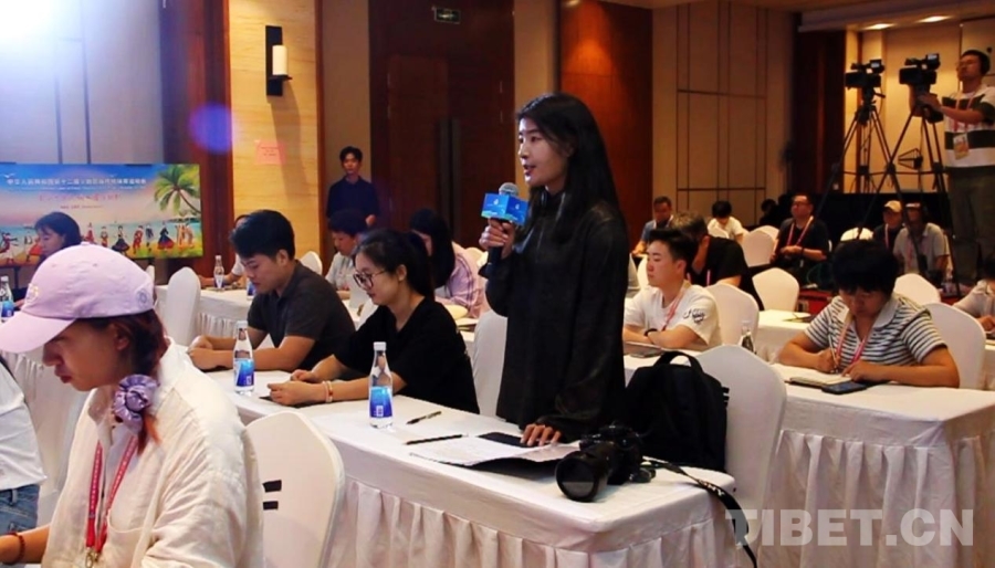 圖為中國(guó)西藏網(wǎng)記者在第十二屆全國(guó)少數(shù)民族傳統(tǒng)體育運(yùn)動(dòng)會(huì)黑龍江、福建、西藏代表團(tuán)新聞發(fā)布會(huì)上提問(wèn) 攝影:劉莉