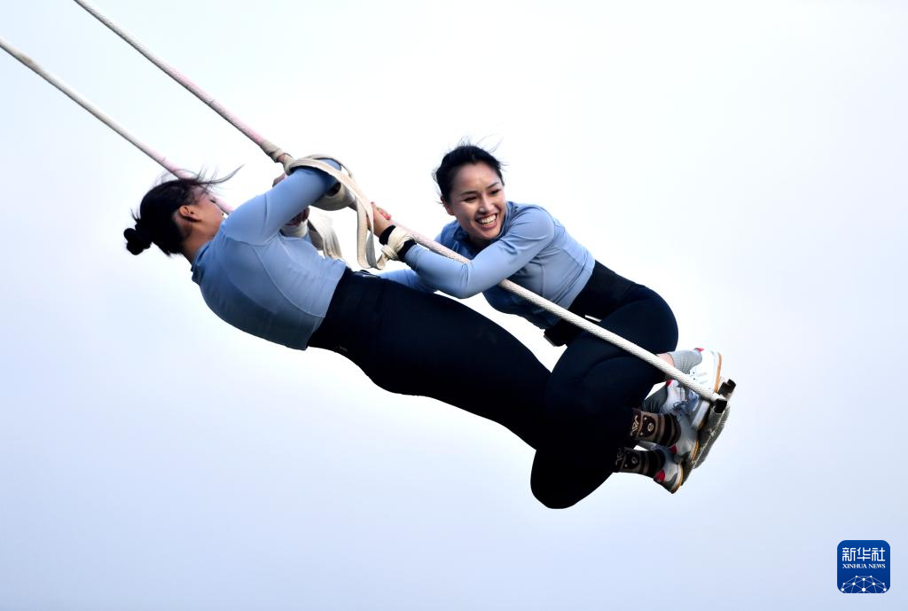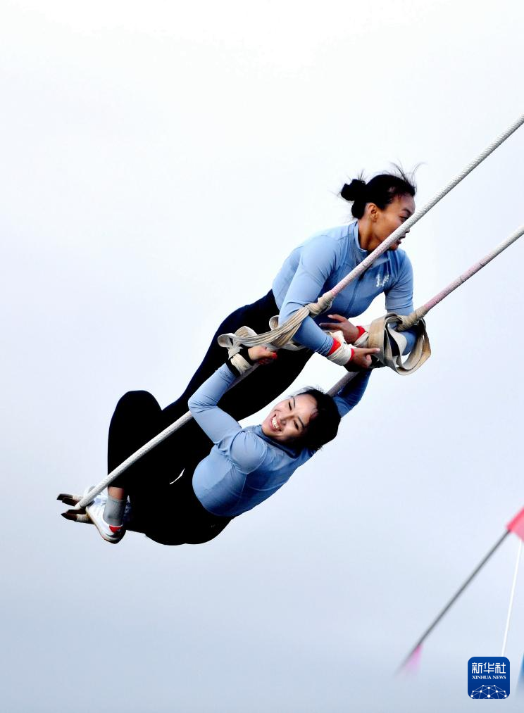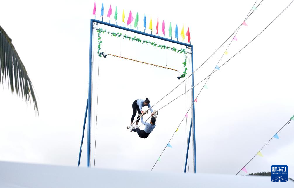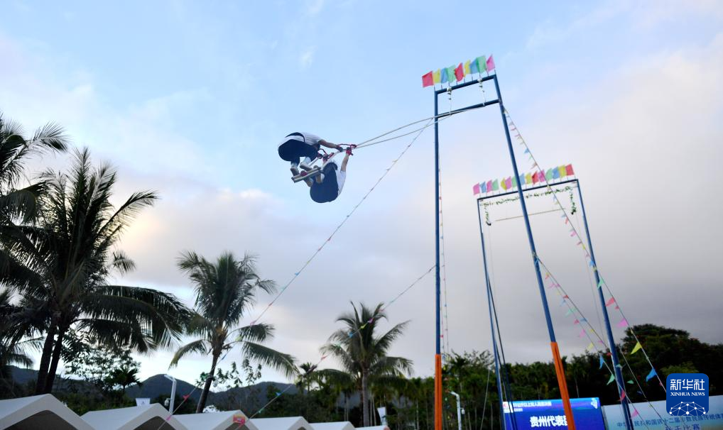 當(dāng)日,第十二屆全國少數(shù)民族傳統(tǒng)體育運(yùn)動會秋千55公斤以上雙人高度決賽在海南三亞舉行。