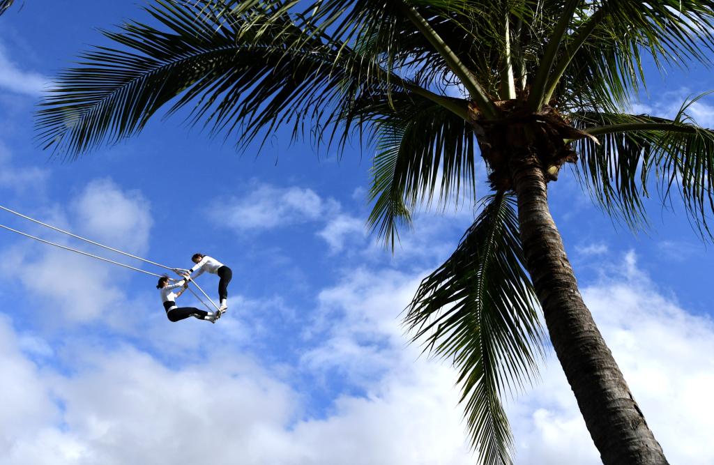 11月24日,上海隊組合劉雨諾/張涵瑾(左)在比賽中。當日,第十二屆全國少數(shù)民族傳統(tǒng)體育運動會秋千55公斤以上雙人高度決賽在海南三亞舉行。新華社記者 王曉 攝