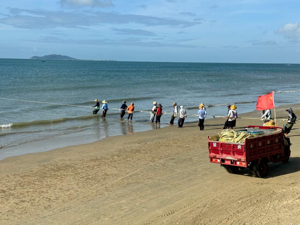 清晨的三亞灣,漁民們正赤腳在沙灘上與大海進行“拔河”——這是當?shù)貪O民收網(wǎng)捕魚的獨特景象,他們要在兩小時內(nèi)收起上千米長的漁網(wǎng)。漁民們期待贏下這場與大海的較量,從而得到豐厚的漁獲。