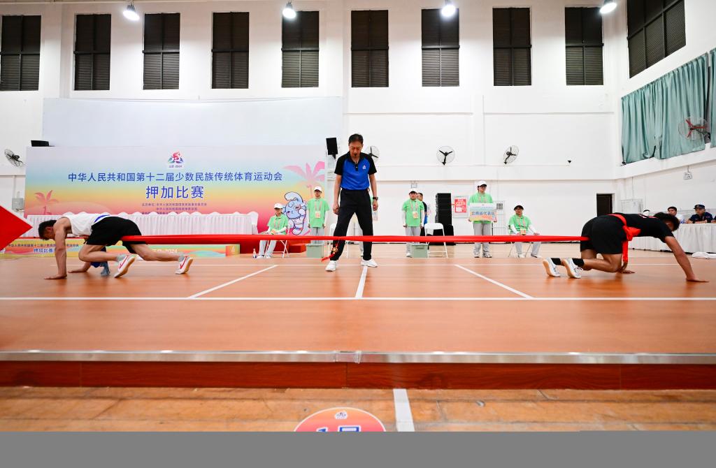 海南熱帶海洋學院體育館內(nèi),第十二屆全國少數(shù)民族傳統(tǒng)體育運動會(以下簡稱“運動會”)押加比賽正在進行中。只見兩位力士背對彼此,奮力向前爬著,一條長長的綢布被兩人拉得筆直。