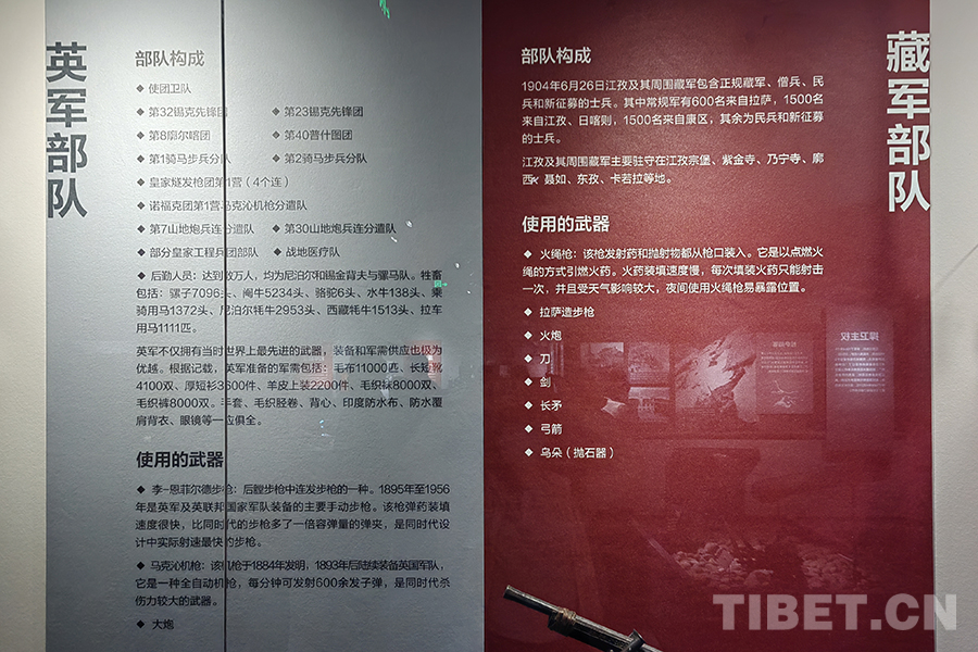 圖為宗山號角——紀念西藏江孜抗英保衛(wèi)戰(zhàn)120周年主題展,對比英帝國主義侵略者與當(dāng)時江孜守軍軍力情況的展板 攝影:楊月云