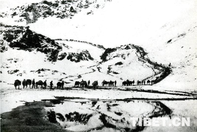 圖為1951年10月,進(jìn)藏部隊(duì)越過(guò)海拔六千余米的冷拉大雪山向拉薩前進(jìn)