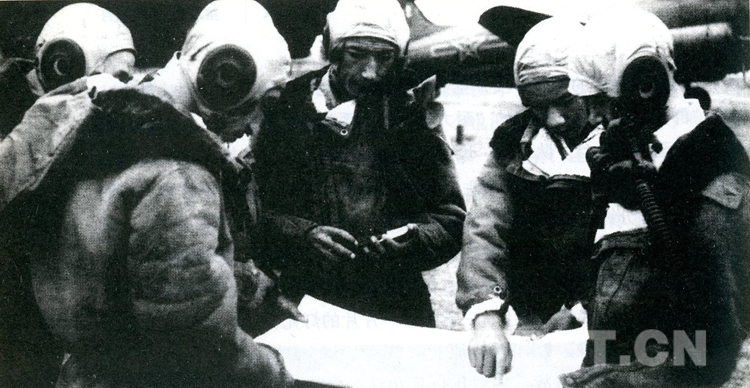 圖為1950年,進(jìn)藏部隊(duì)供應(yīng)十分困難??哲姾竭\(yùn)大隊(duì)接受了向進(jìn)藏部隊(duì)空投食物的命令。圖為飛行員在研究康定、甘孜空投的航線(xiàn)。