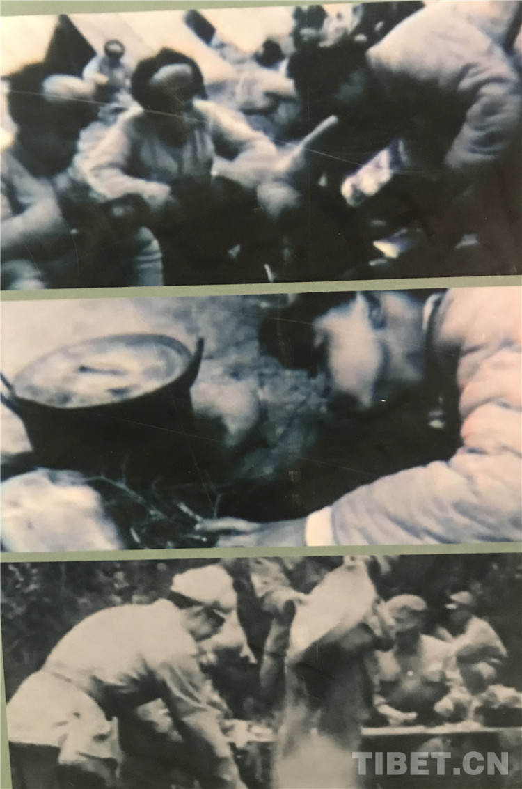 圖為修路和建設(shè)機場休整期間,戰(zhàn)士們熱火朝天,生火做飯的場景。 翻拍:龍真多吉