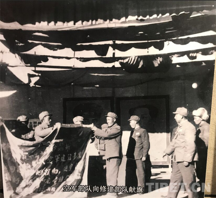 圖為空軍部隊向修建部隊獻旗。 翻拍:龍真多吉