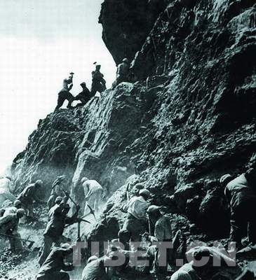 圖為十八軍筑路部隊在絕壁上鑿路 圖片來源:《中國西藏》雜志