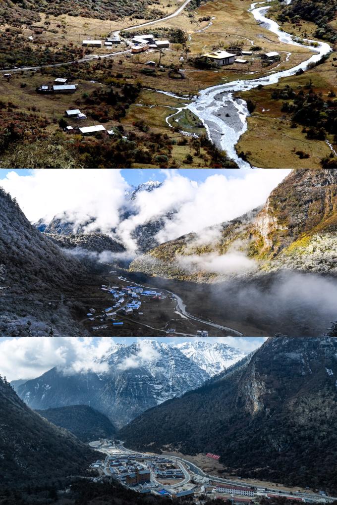 拼版照片:上圖是2003年10月26日拍攝的玉麥鄉(xiāng)(新華社記者 索朗羅布 攝);中圖是2017年10月31日拍攝的玉麥鄉(xiāng)(新華社記者 普布扎西 攝);下圖是2026年2月5日拍攝的玉麥鄉(xiāng)(無(wú)人機(jī)照片,新華社記者 丁增尼達(dá) 攝)。