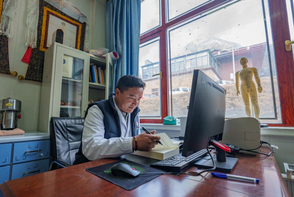 2月5日,玉麥鄉(xiāng)衛(wèi)生院副院長(zhǎng)次旦米久在辦公室研讀藏醫(yī)書籍。新華社記者 丁增尼達(dá) 攝