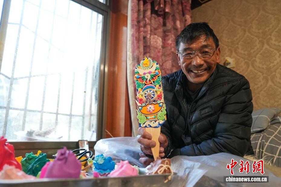 2月4日,隨著藏歷新年臨近,拉薩街頭年味漸濃,年貨市場上的“孜扎”迎來熱銷。酥油花藏語稱“孜扎”,是藏歷新年吉祥物切瑪盒的重要組件,也是藏族民眾家中必備的年貨。酥油花以酥油為主要原料,由匠人純手工捏制而成,造型涵蓋佛像、人物、花卉樹木、飛禽走獸等,常見圖案包含吉祥八寶、和諧四瑞、長壽圖等,承載著藏族民眾對新年平安吉祥、萬事順遂的美好祈愿。圖為手工藝人展示制作完成的酥油花。貢確 攝